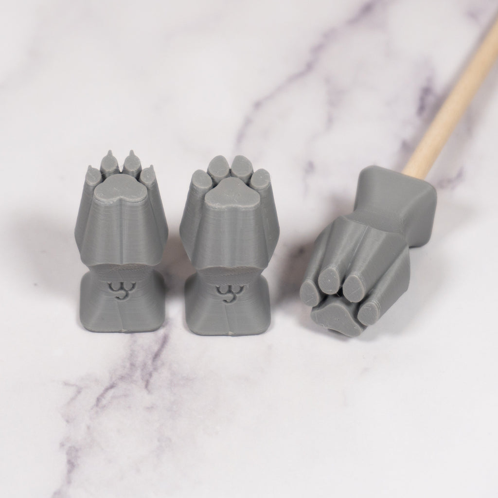 A set of nine clay stamps of dog paw prints in three different sizes (X-Large, Large, Medium), each with three variations, perfect for use on a food or water dish for your dog, or to decorate anything with your love for dogs.
