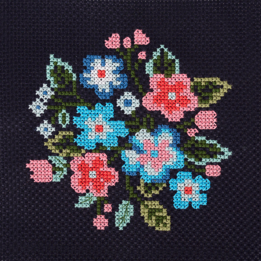 Counted cross stitch design. Kit includes: black, cotton, 11 count aida fabric; 6 strand, polyester, embroidery thread; needle; printed colour coded design and instructions in 6 languages: (EN/FR/DE/ES/IT/NL). Approximate finished size of design: (w/h) 13 x 13cm. Canvas size: (w/h) 17 x 17cm. Do not dry clean, hand wash in cold or warm water, and use a neutral detergent.