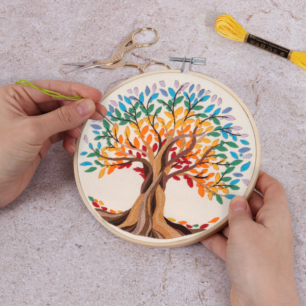 Embroidery kit with hoop. Kit Includes: 15cm bamboo hoop; pre-sorted, 6 strand, polyester embroidery threads; embroidery needle; 25 x 25cm cotton fabric with pre-printed design; felt backing and instructions in 3 languages (EN/FR/DE). Approximate finished size: (diam) 15cm. Do not dry clean. hand wash in cold or warm water. Use a neutral detergent.